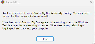 Another instance of LaunchBox or Big Box is already running. You may need to wait for the previous instance to exit.