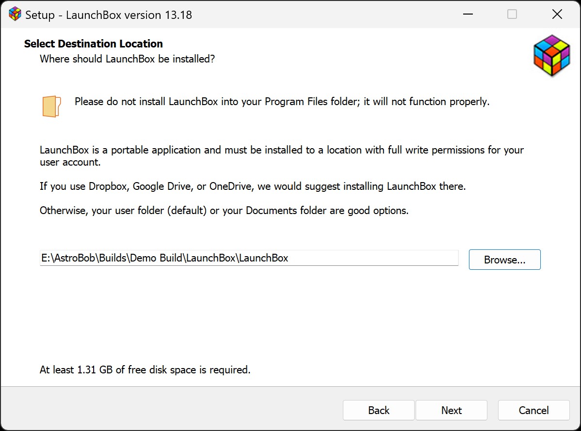 During installation, you’ll be asked to choose where to install LaunchBox. It is highly recommend to Install the main LaunchBox build on an internal SSD for optimal performance. Games and media files can be stored either as part of the main build or on external or network drives and configured later.