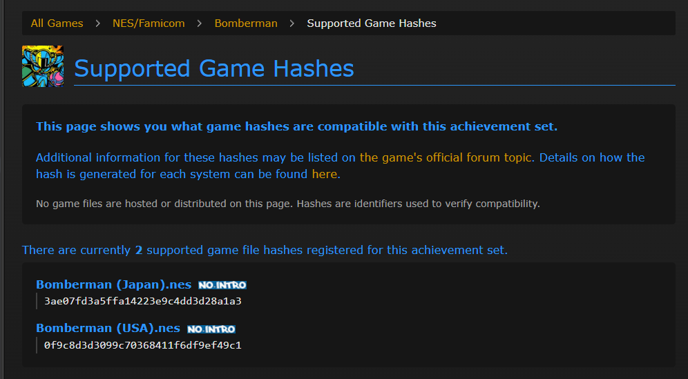 Once you have the RetroAchievementsHash value from LaunchBox, compare it to the supported files listed on RetroAchievements.org.